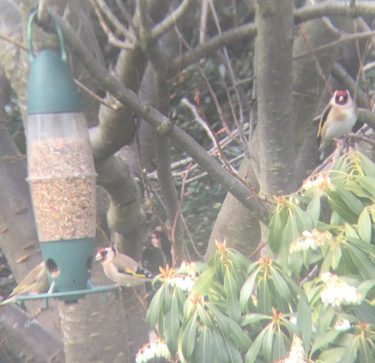 One weekend I was looking at the birds in the garden feeding on the feeders and I got some very exciting visitors. First I noticed a few Goldfinches actually feeding out my feeder, normally I see them high above the trees they never ever come to the feeders so I quickly took a picture.