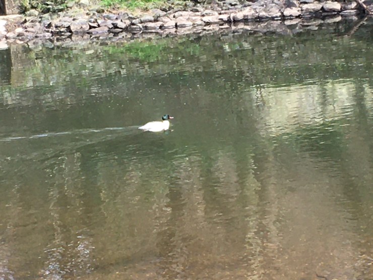 At the beginning of April I had a morning walk down The River Almond, it was lovely listening to the birds but the birds I saw on the river were a male & female Gooseanders. On my way back I spotted the male swimming on his own.