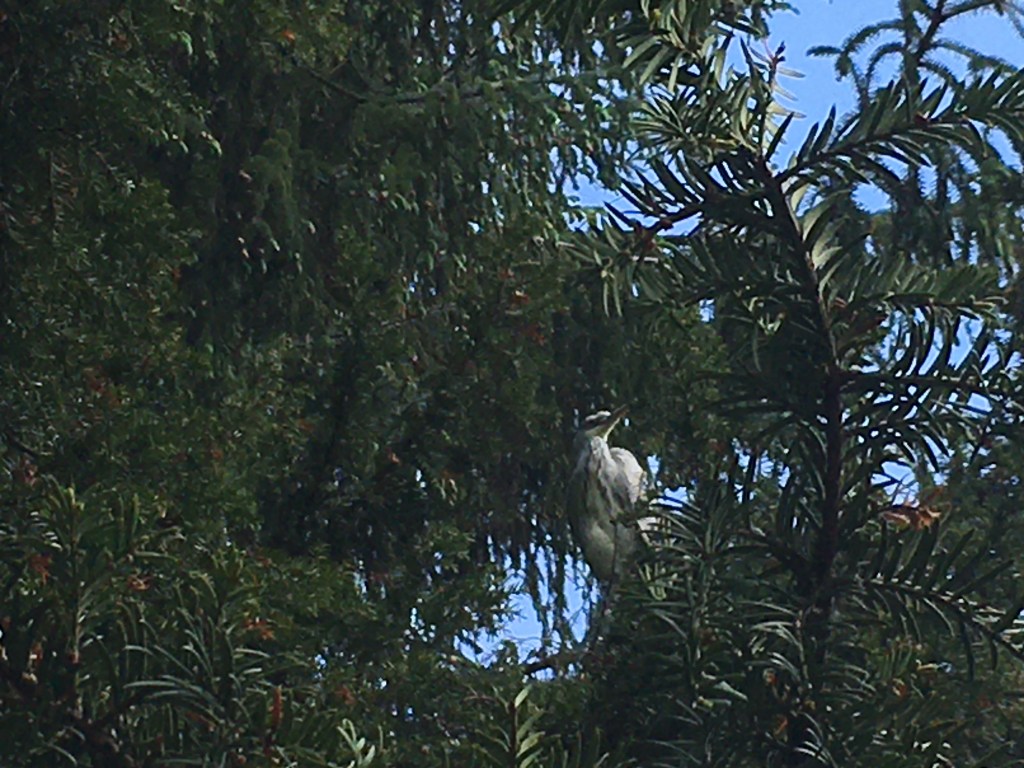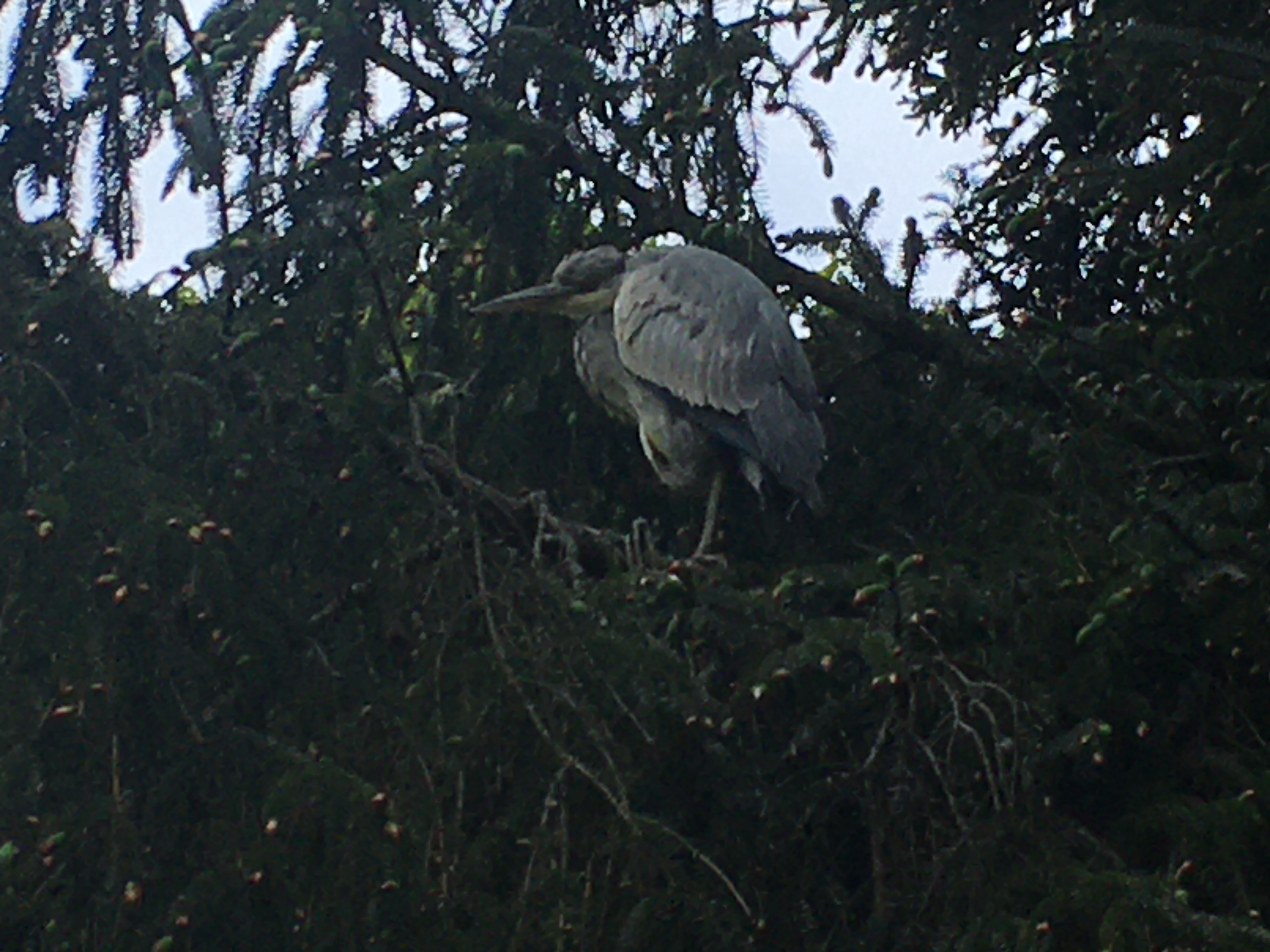 The following week the nice warm sunshine returned and I was watching The Heron at the pond along with a Moorhen then The Heron flew up to the tree.