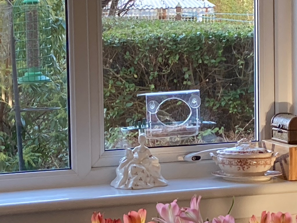 One morning I enjoyed a bit of Garden Birding. I had moved my feeder station pole away from the nest boxes because there has been some birds checking them out so didn’t want to put the birds off from nesting just in case big birds mainly Crows & Magpies turn up causing the birds not to move in the nest box. I had moved the pole near the window of the lounge and in this particular morning I watched a Robin on the window feeder which a Blackbird went to yesterday but on this day The Bkackbird was expecting the dish full of mealworms but wasn’t brave enough to have some. A Robin went to the dish and took some mealworms and a Great Tit was walking about on the ground.