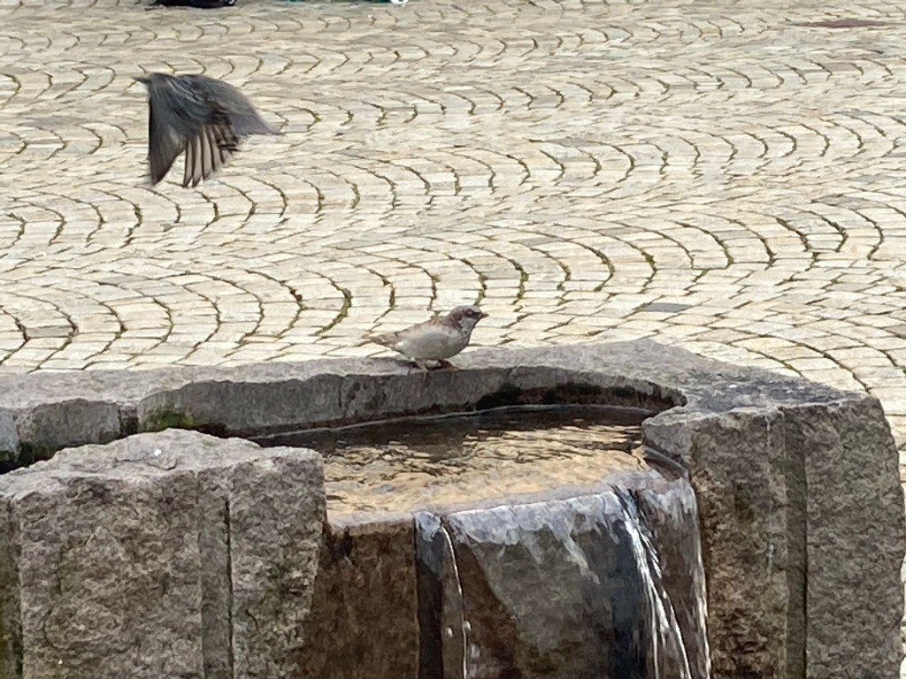 On a walk to a coffee shop for coffee and cake passed a mini fountain were House Sparrows & Starlings were enjoying a splash and a drink. At the cafe more House Sparrows we’re looking for scraps.